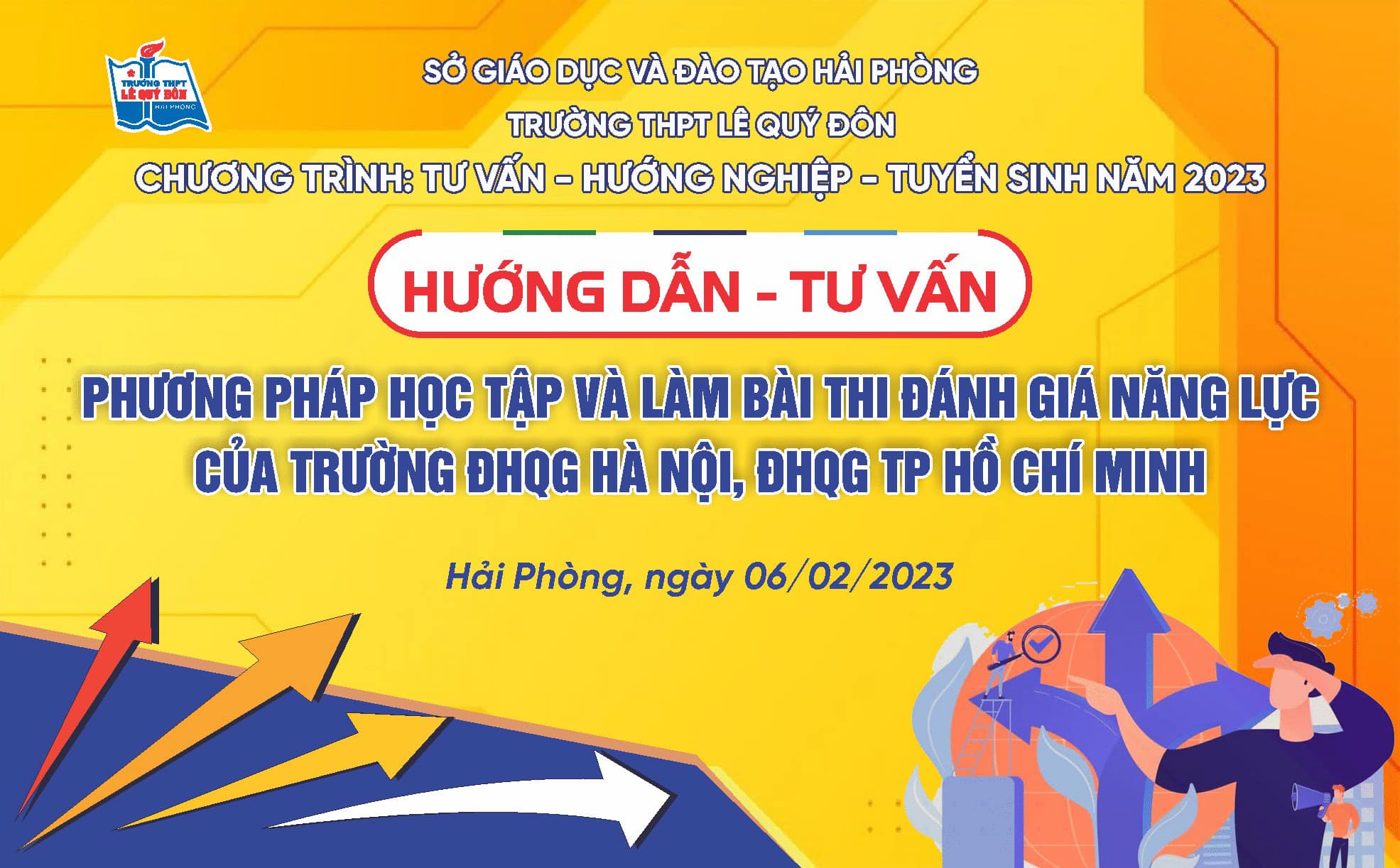 Kỳ thi ĐGNL năm 2023. Bạn sẽ học và thi như thế nào cho hiệu quả ? Muốn hiểu rõ hơn, từ 7h đến 9h sáng thứ 2 ngày 6/2/2023 tại trường THPT Lê Quý Đôn, bạn sẽ được nghe các chuyên gia của trường ĐHQG Hà Nội tư vấn. Nhà trường tổ chức tại sân trường cho toàn bộ HS K11-12 cùng các thầy cô giáo và có cả phụ huynh của trường. Trân trọng kính mời các thầy cô giáo, các bậc CMHS, các em học sinh các trường khác, quan tâm có thể đến trường Lê để cùng chia sẻ.
