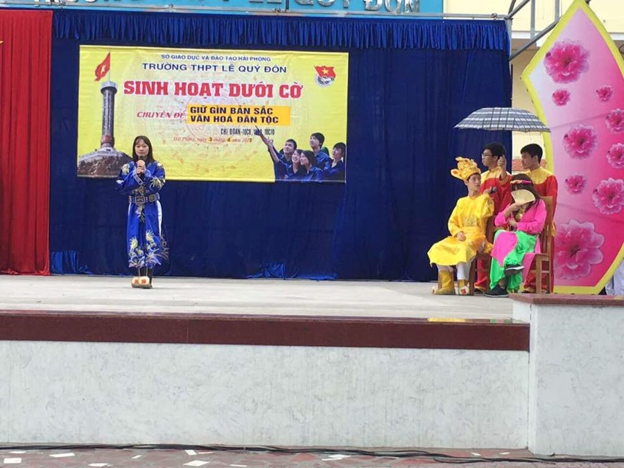 Bản sắc văn hóa dân tộc là thiêng liêng, quý giá, nó tạo nên cái đặc thù của một dân tộc. Nó được hình thành trong lịch sử lâu dài của một dân tộc, được đúc kết từ kinh nghiệm sống, được lưu truyền qua nhiều thế hệ, gắn bó máu thịt với con người. Nó tồn tại tự nhiên không thể ép buộc nhưng đòi hỏi phải biết giữ gìn, bảo lưu. Nó có thể được biểu hiện ra bề ngoài nhưng cũng có thể ẩn sâu trong tâm hồn con người. Và để ghi nhớ đến bản sắc dân tộc, thầy và trò trường THPT Lê Quý Đôn đã có buổi sinh hoạt dưới cờ đầy ý nghĩa, đc chính các em học sinh thể hiện và bày tỏ những tình cảm và sự trân trọng của mình!