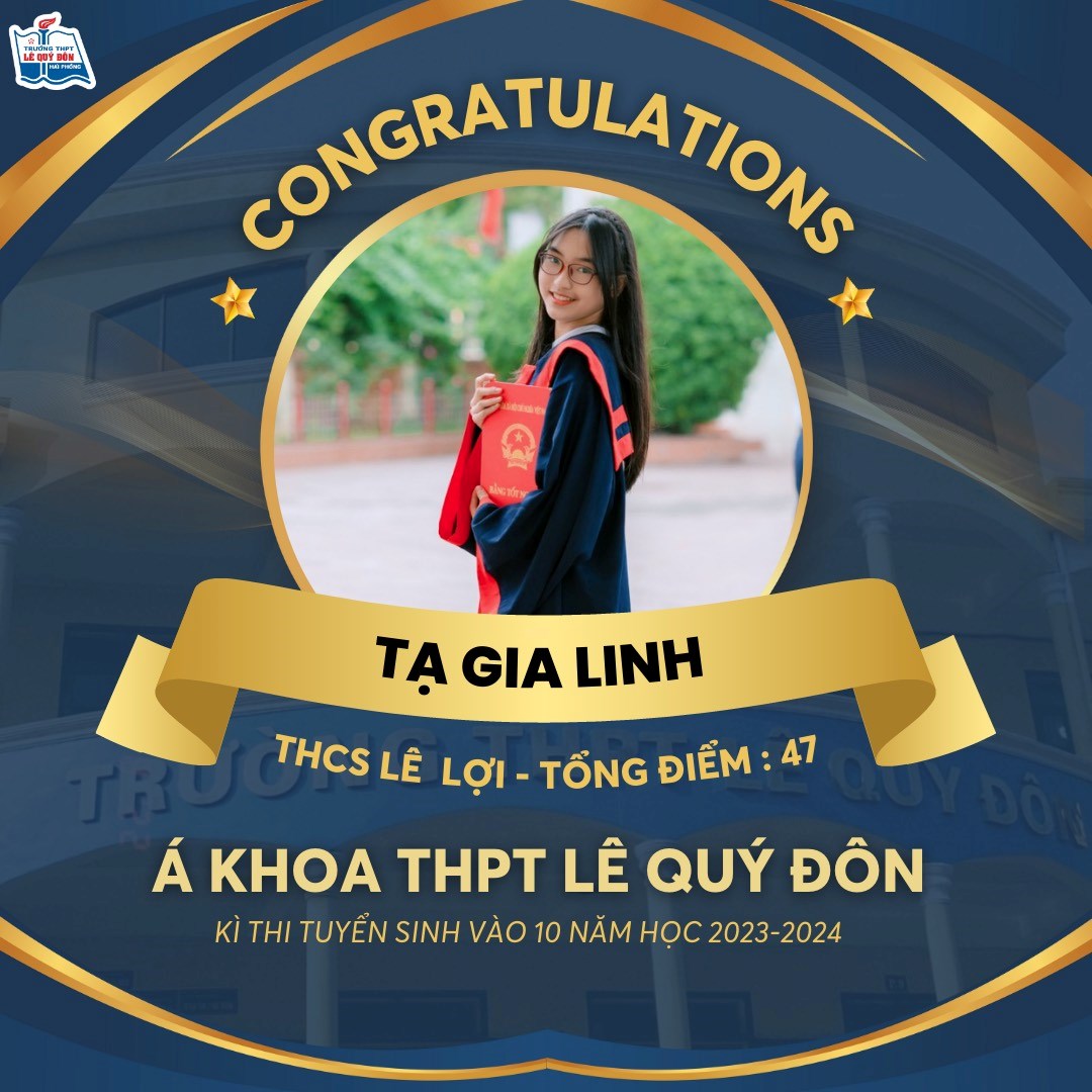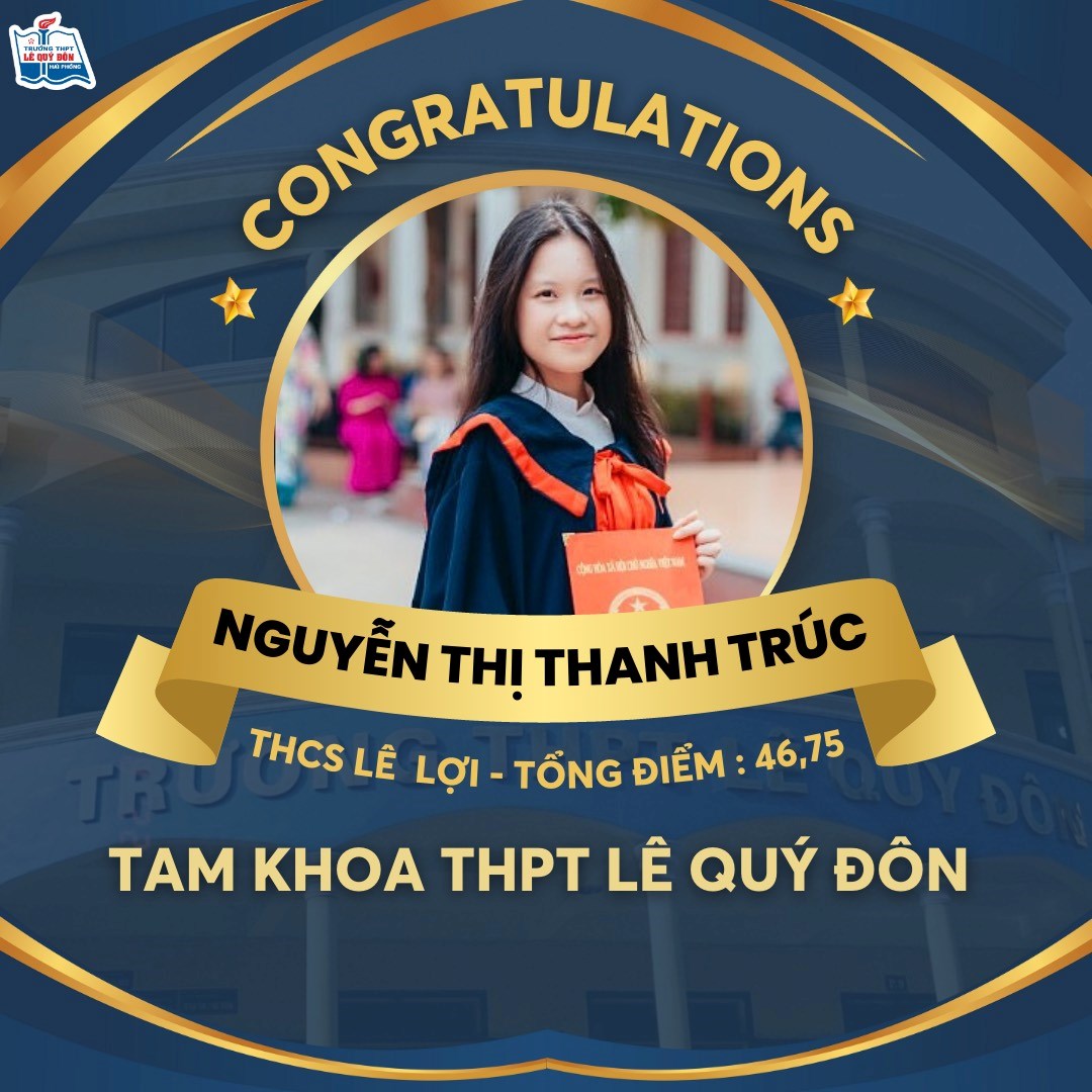 Chúc mừng 3 thí sinh xuất sắc đạt kết quả cao nhất trong Kỳ thi tuyển sinh vào lớp 10 trường THPT Lê Quý Đôn năm học 2023-2024. Chào mừng các em đến với ngôi nhà Màu xanh. Hi vọng và mong đợi thật nhiều những bứt phá của các em trong 3 năm học tới.