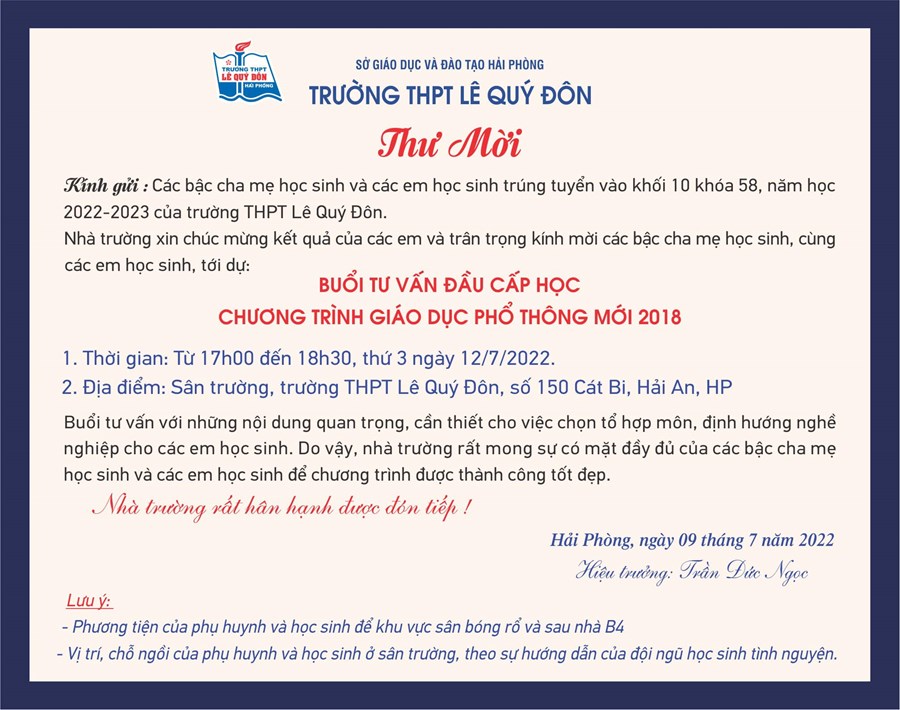 Nhà trường có thư mời các bậc CMHS và các em đến dự buổi tư vấn đầu cấp. Thời gian: Từ 17h đến 18h30 T3(12/7/2022).
